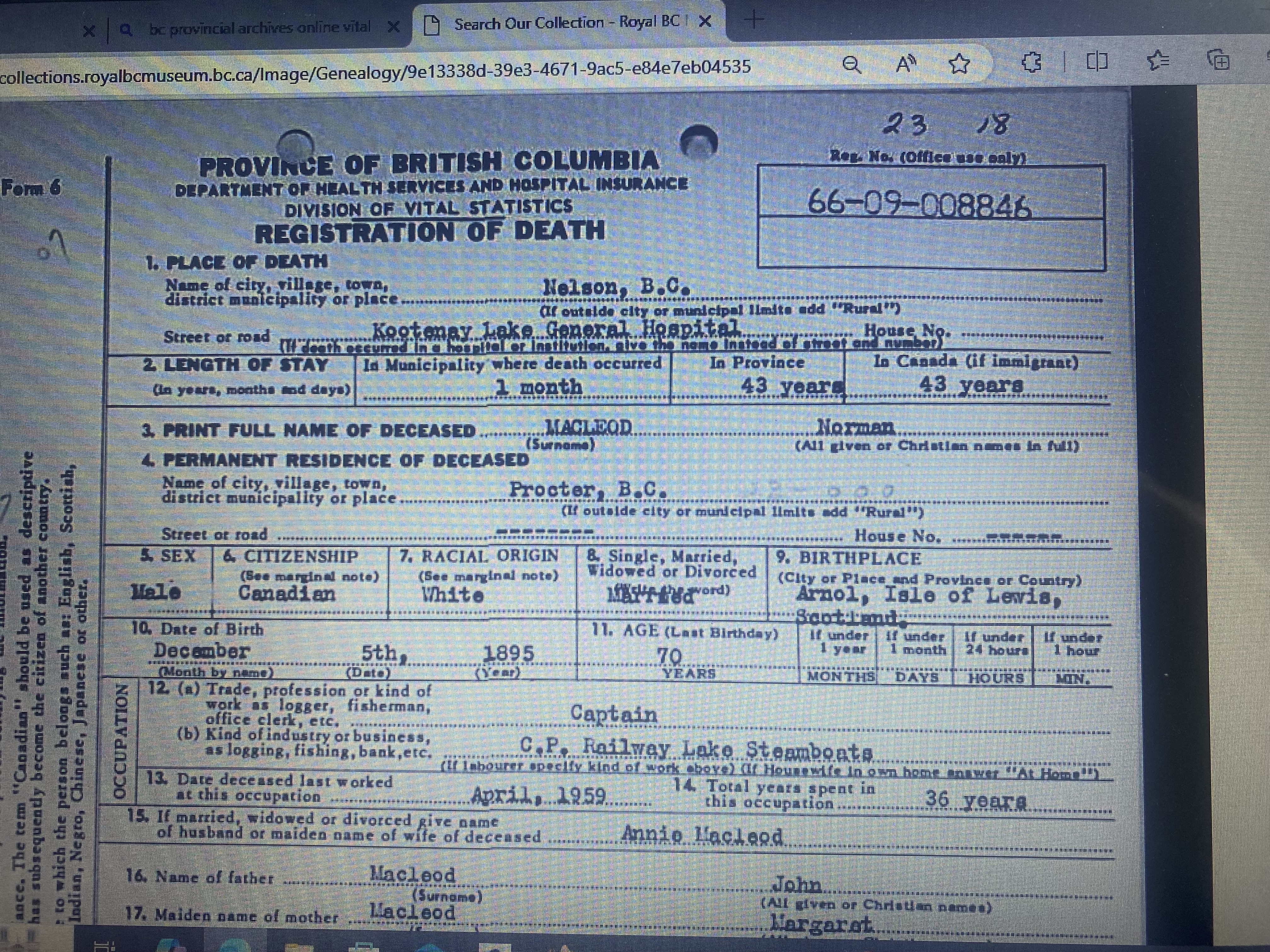 Someone asked me recently what I knew about the captain we posed with. I did not know much about him, so did some online research of provincial vital statistic records, and of the Nelson Daily News, as well as books and visitor information from the Kootenay Lake Historical Society. Other versions of the spelling of his last name are McLeod and Macleod.