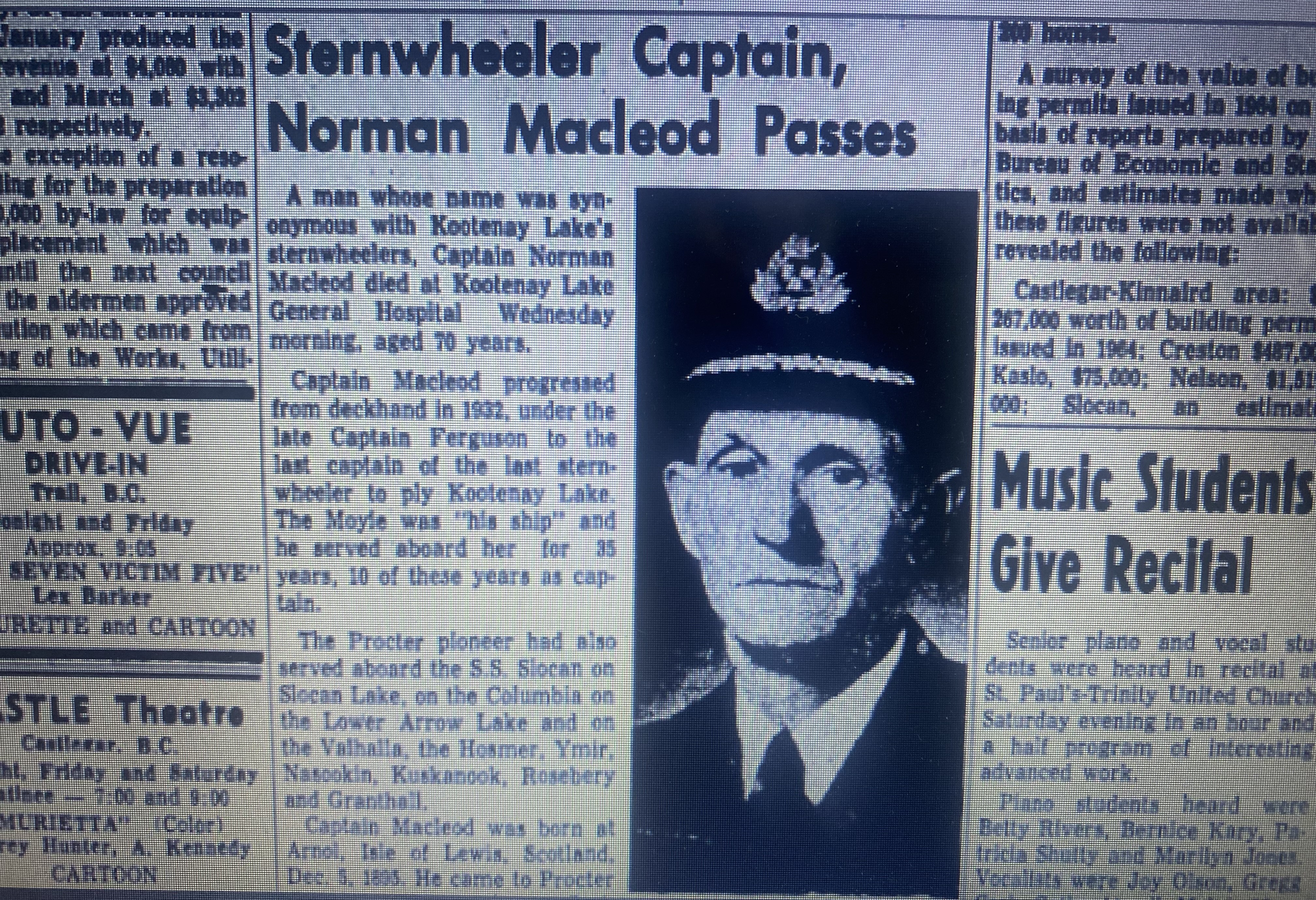 Information on Captain MacLeod in his 1966 death certificate.Nelson Daily News June 9, 1966 report on death of Capt. Norman MacLeod.Today the SS Moyie is a National Historic Site safely secured on the beach of Kaslo Bay. It benefits from ongoing programs of restoration and preservation.On Canada Day, July 1, 2024, this family was among the visitors to the Moyie wheelhouse, where Captain Norm MacLeod presided from the early 1930s until the Moyie concluded service in April 1957.The stylish interior of SS Moyie, July 1, 2024View out from the Moyie captain’s wheel. 2024.