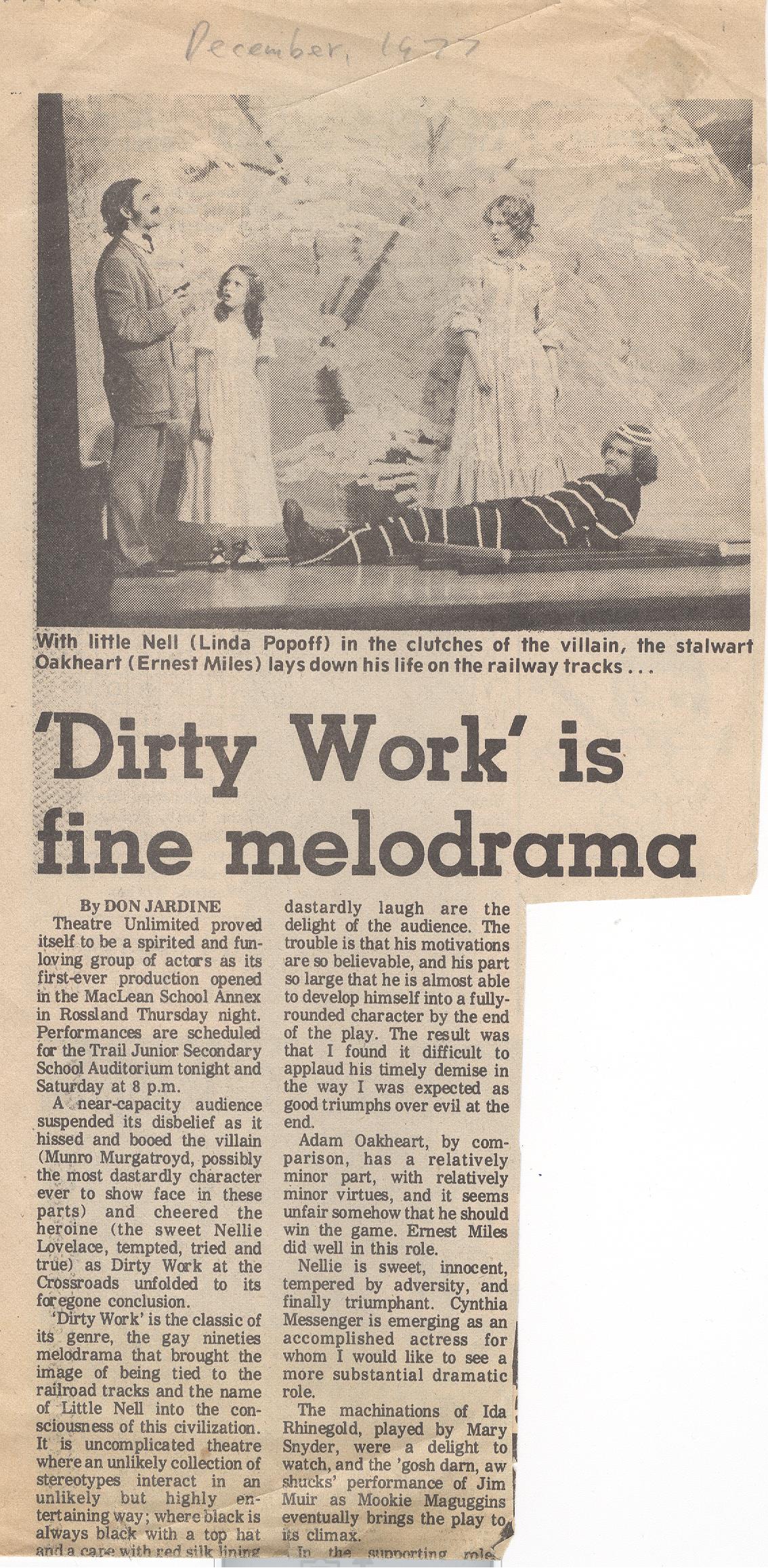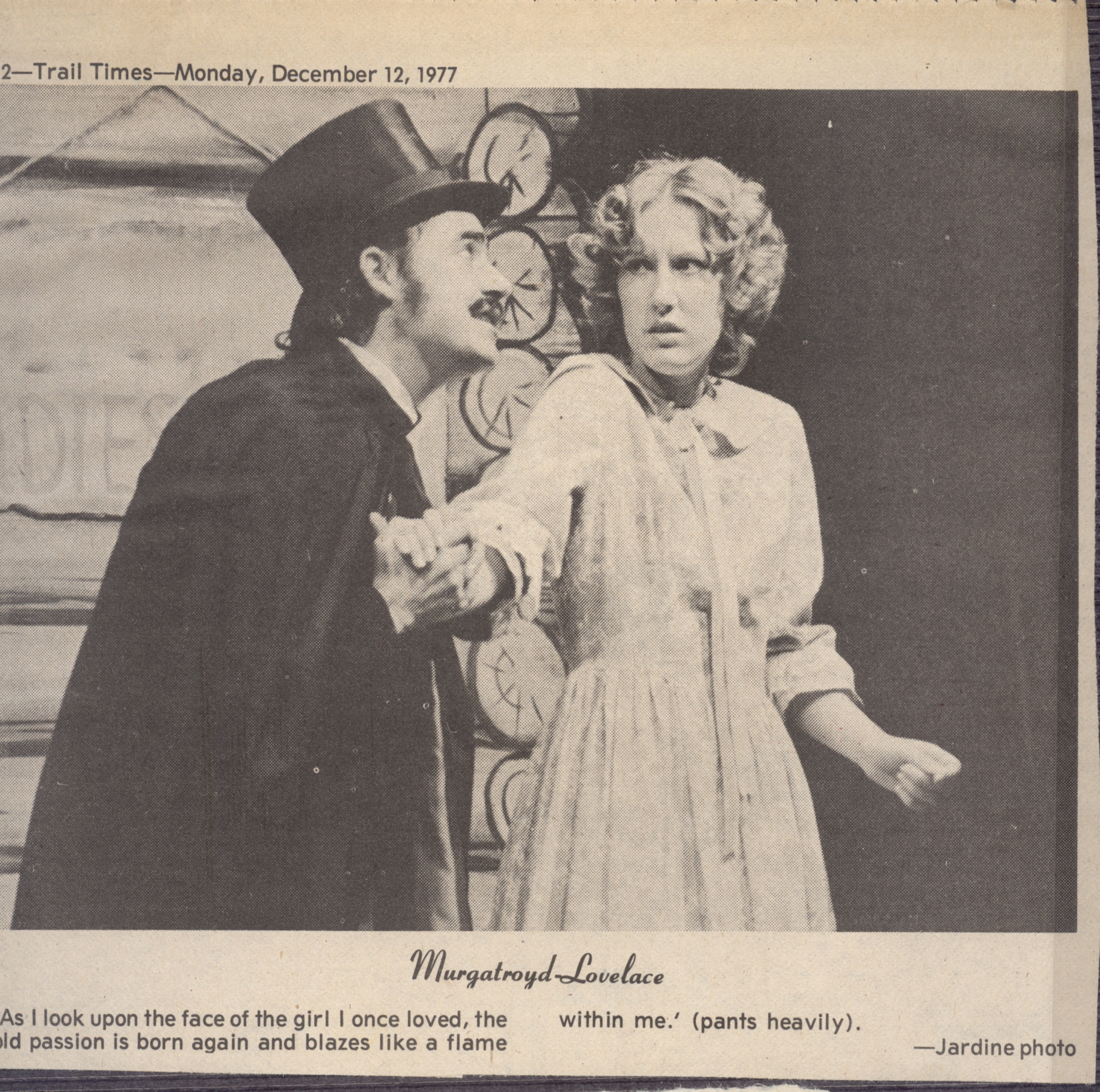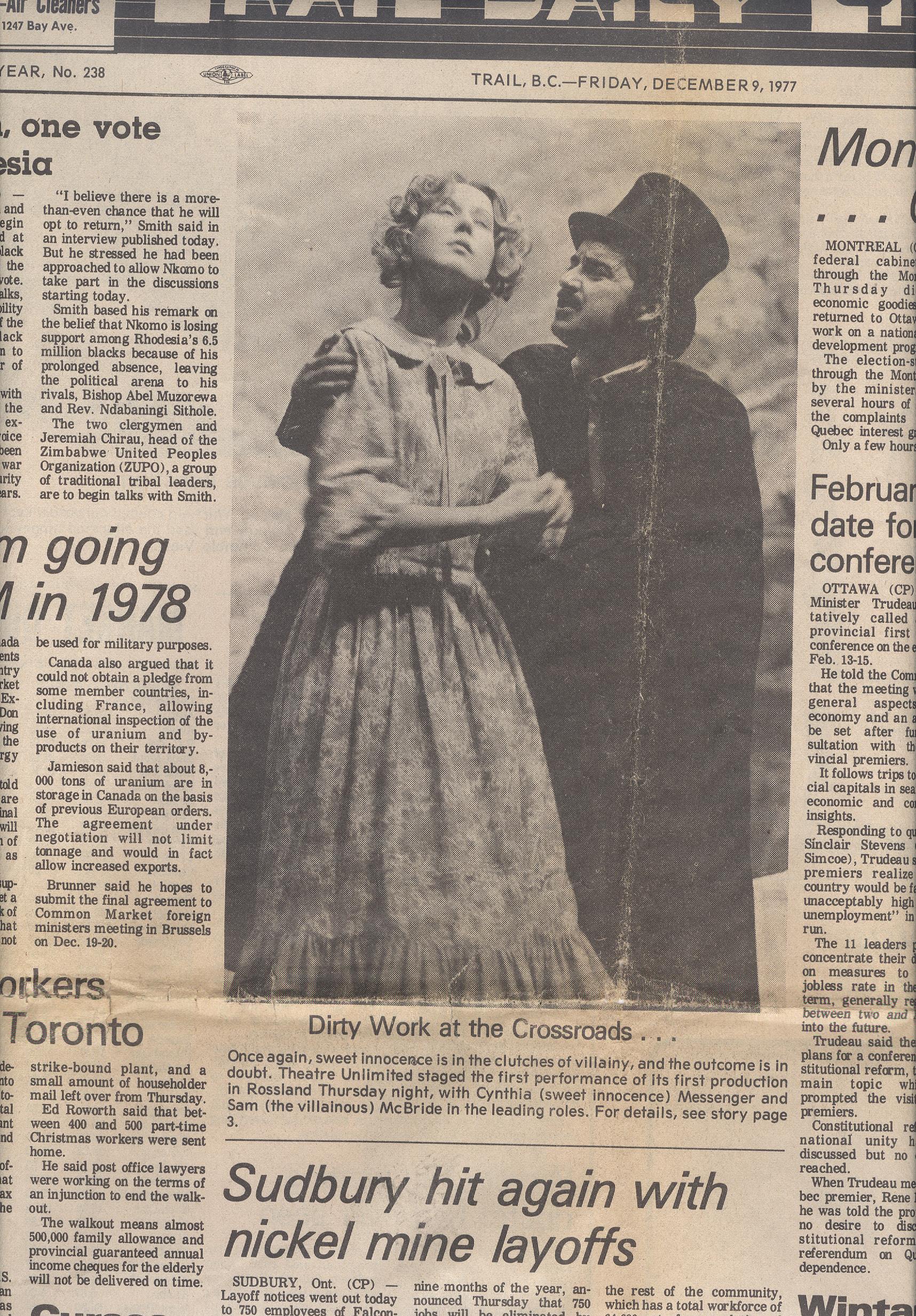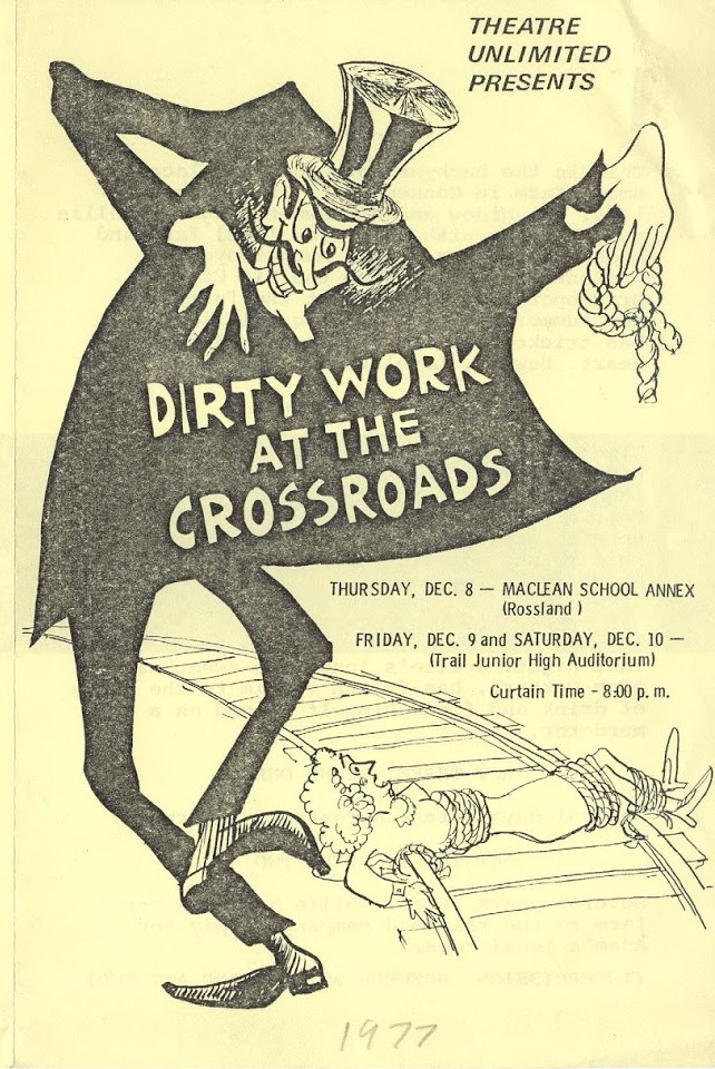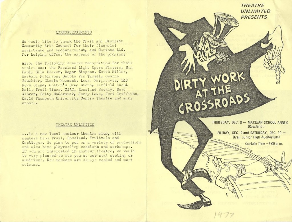 Community theatre returned to Trail, British Columbia in the fall of 1977 with performances of the classic melodrama “Dirty Work at the Crossroads” by the new theatre club Trail Theatre Unlimited. The group included several newcomers as well as veterans of the former Trail Little Theatre group which was active for a number of years.