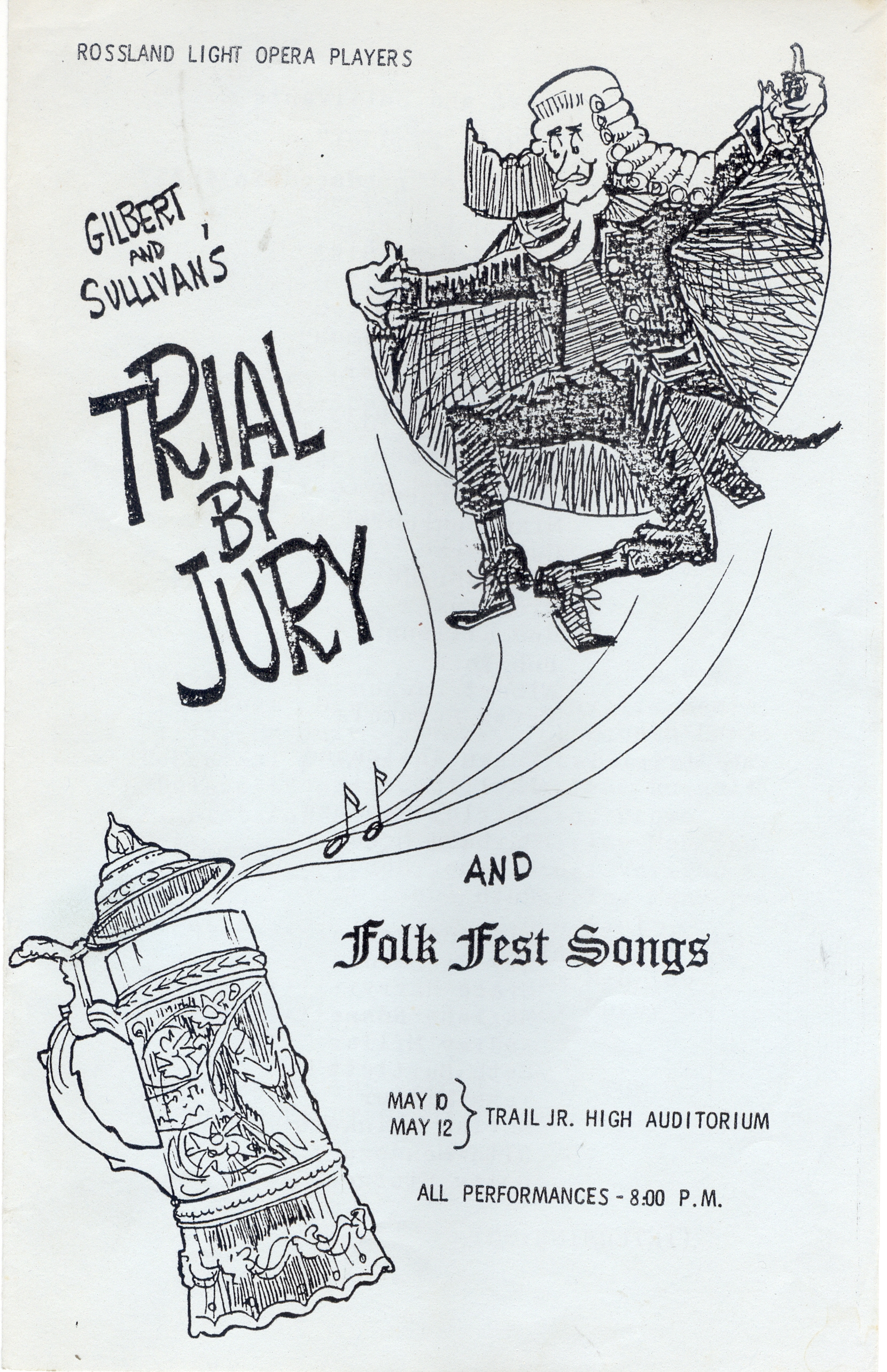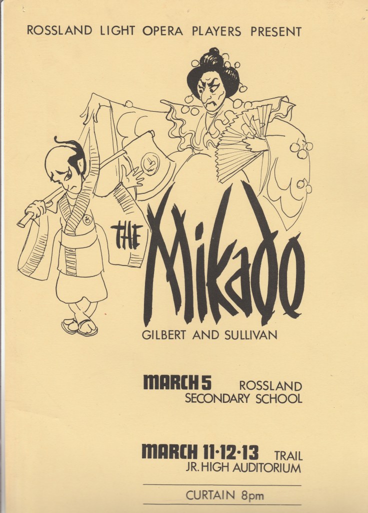 I worked at the Cominco B.C. Group public relations department as a writer, and one of my colleagues at the Main Gate Building in Trail was graphic artist George Bourchier from Rossland, who shared my interest in community theatre. He was very involved with the Rossland Light Opera Players (RLOP) for many years, both as an organizer and performer, following in the footsteps of his late father Eric Bourchier who was an RLOP founding member in 1952 and a huge fan of Gilbert and Sullivan musicals which he learned growing up in England. Taking after his father, George not only memorized much of the dialogue in the major Gilbert and Sullivan shows (e.g. Mikado, Trial By Jury, Pirates of Penzance, HMS Pinafore), he also got to know the “business” of the characters, such as movement and expressions that became part of the G&S tradition.