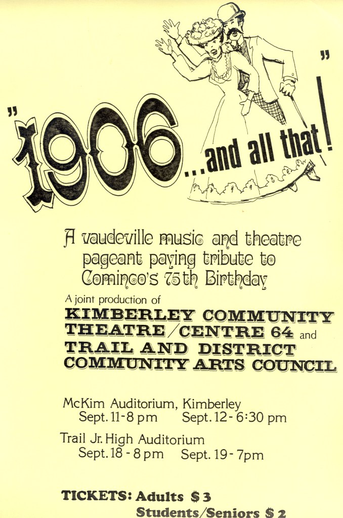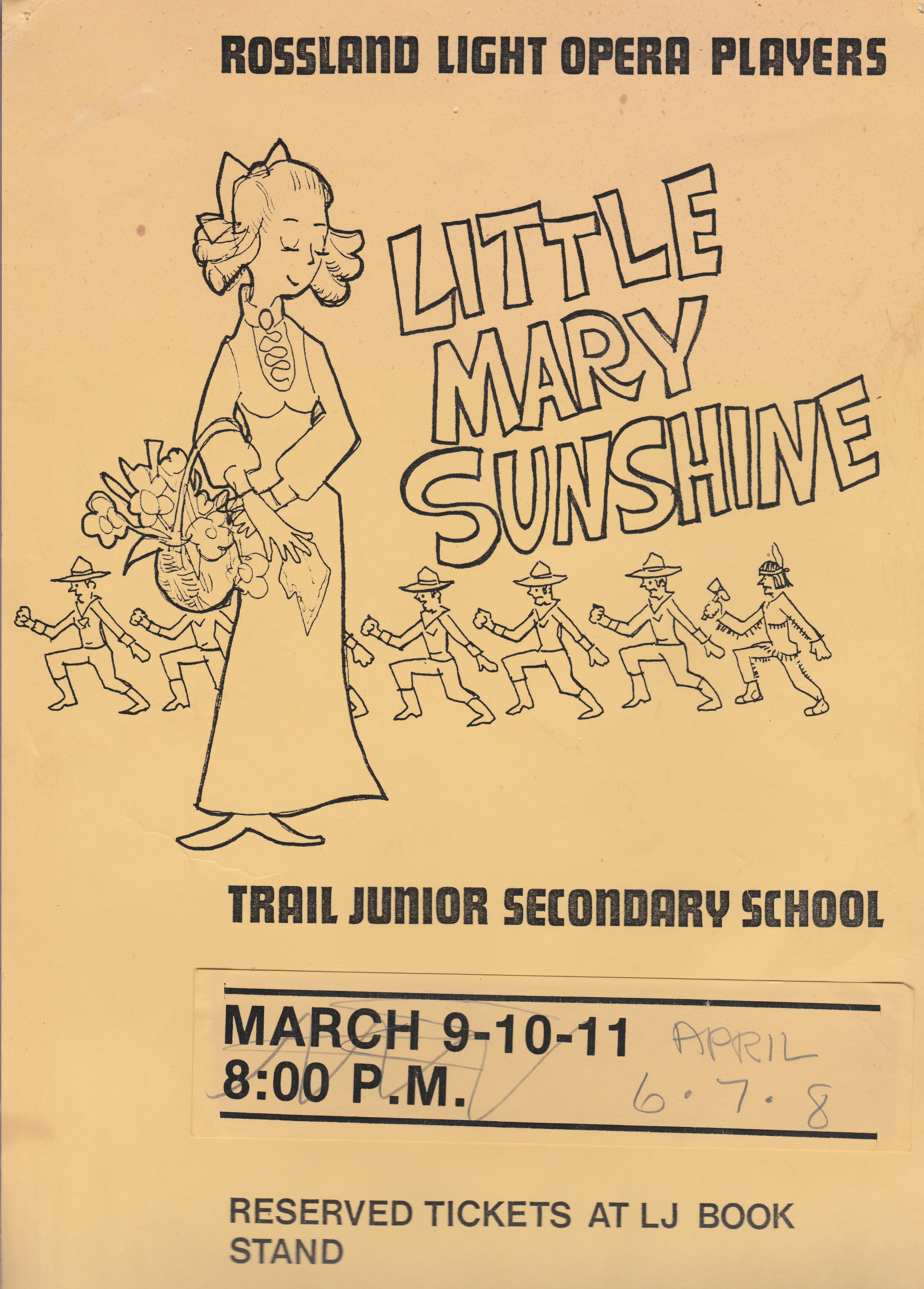 With some start-up funding provided by the Trail and District Arts Council, an initial organizing meeting got the ball rolling for a non-profit society that would present a variety of shows well into the 1980s. Several of the members were also volunteers with the long-established Rossland Light Opera Players.