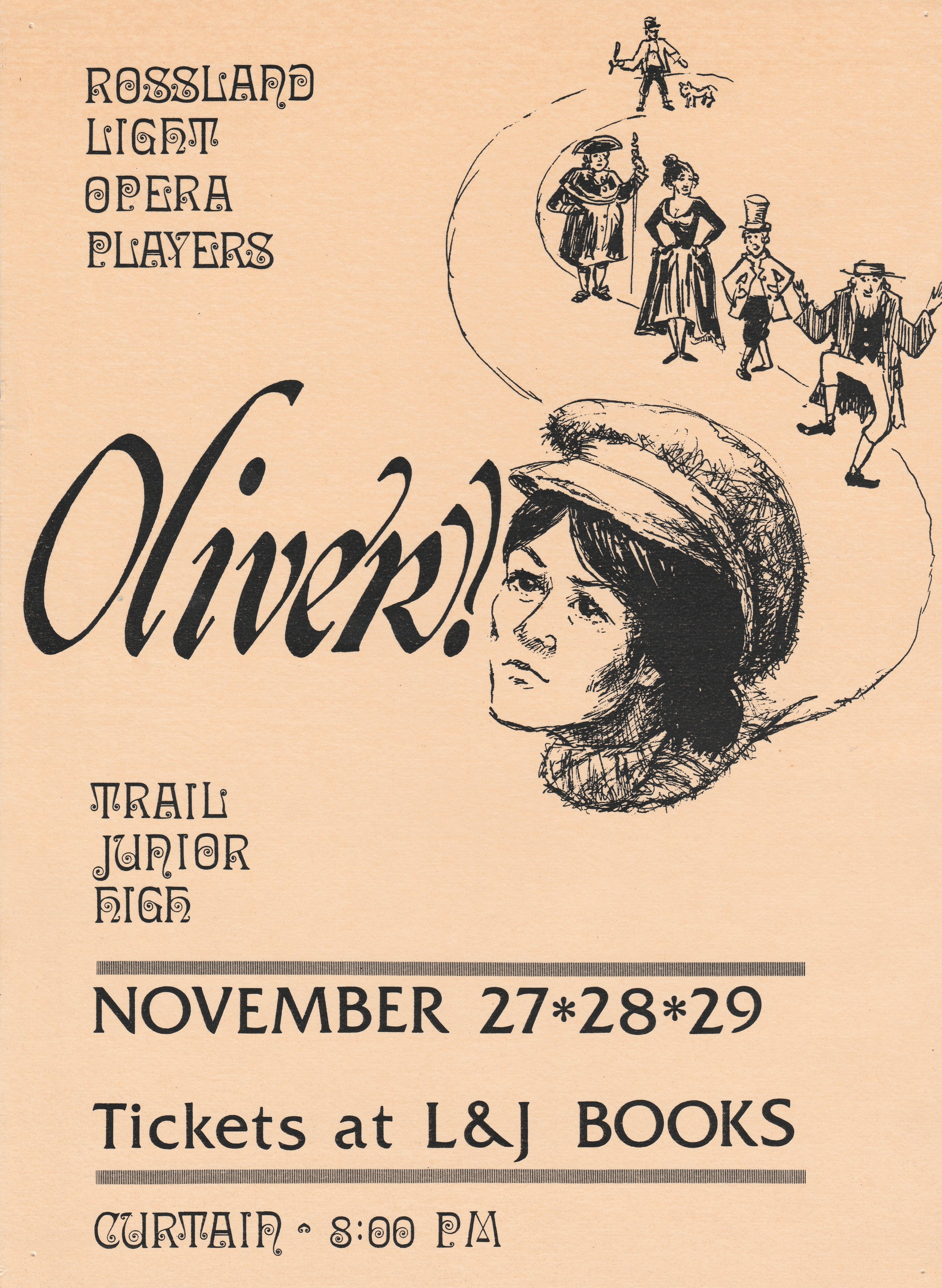 RLOP’s production of Lionel Bart’s hit musical “Oliver” (based on the story of Dickens’ Oliver Twist) was a big hit with local audiences in 1980 and great fund-raiser for RLOP finances. George played Mr. Bumble, whose songs included “Boy for Sale”, while I had a couple of secondary roles. What stands out in my memory of the show is the stellar performances of two local boys — Dean Cristofoli as Oliver and Bobby Gardiner as the Artful Dodger. Dean’s father Ed Cristofoli was a member of the the famous Trail Smoke Eaters hockey team that won the world championship in 1961.