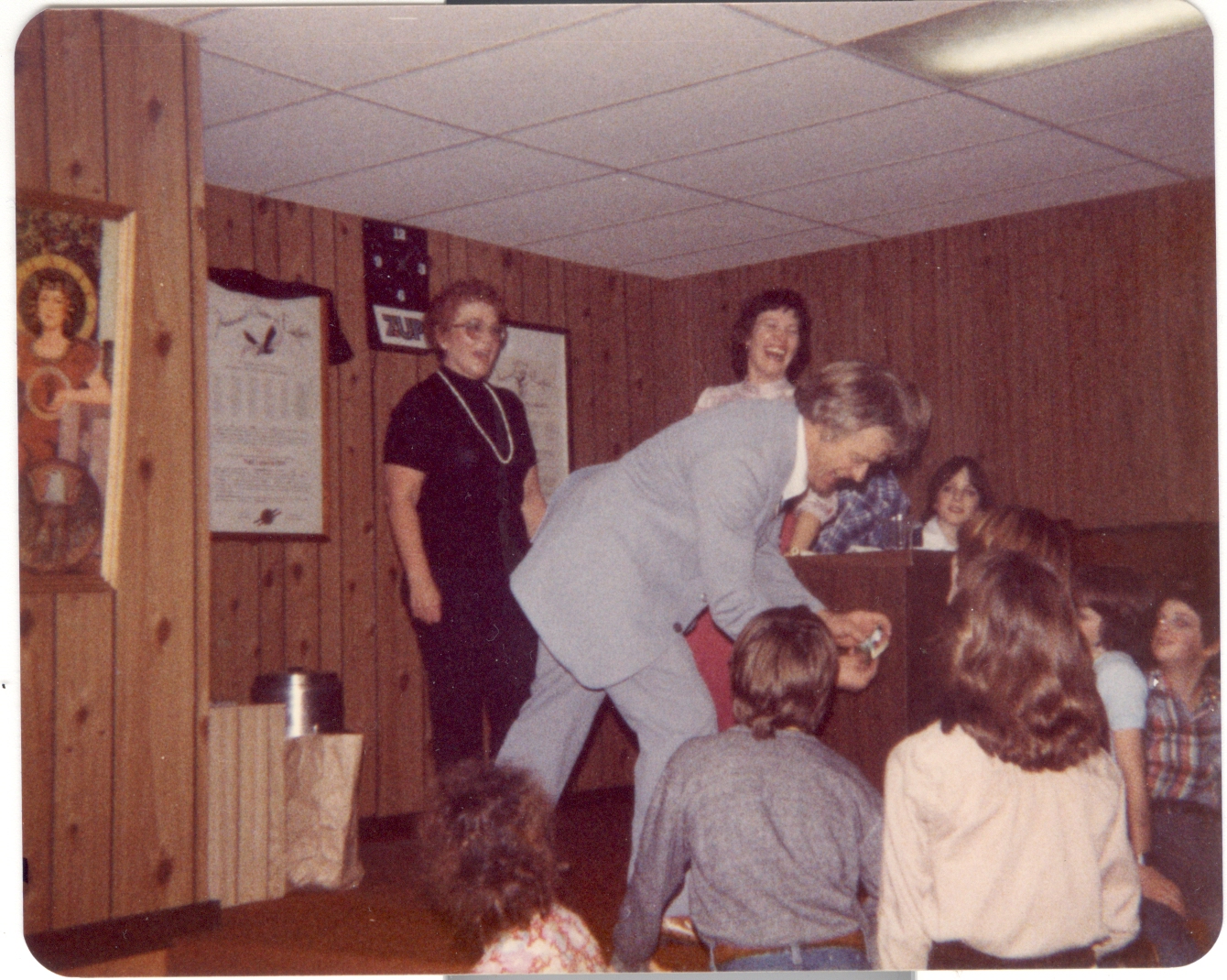 George Bourchier (in blue suit) makes a fun presentation at the cast party following the performances of the musical “Oliver” in 1980. George played the role of Mr. Bumble in the RLOP production, including a memorable solo “Boy for Sale”.1981