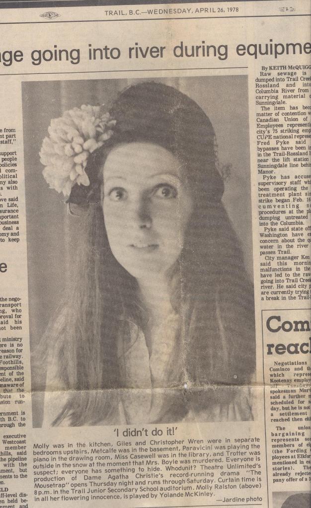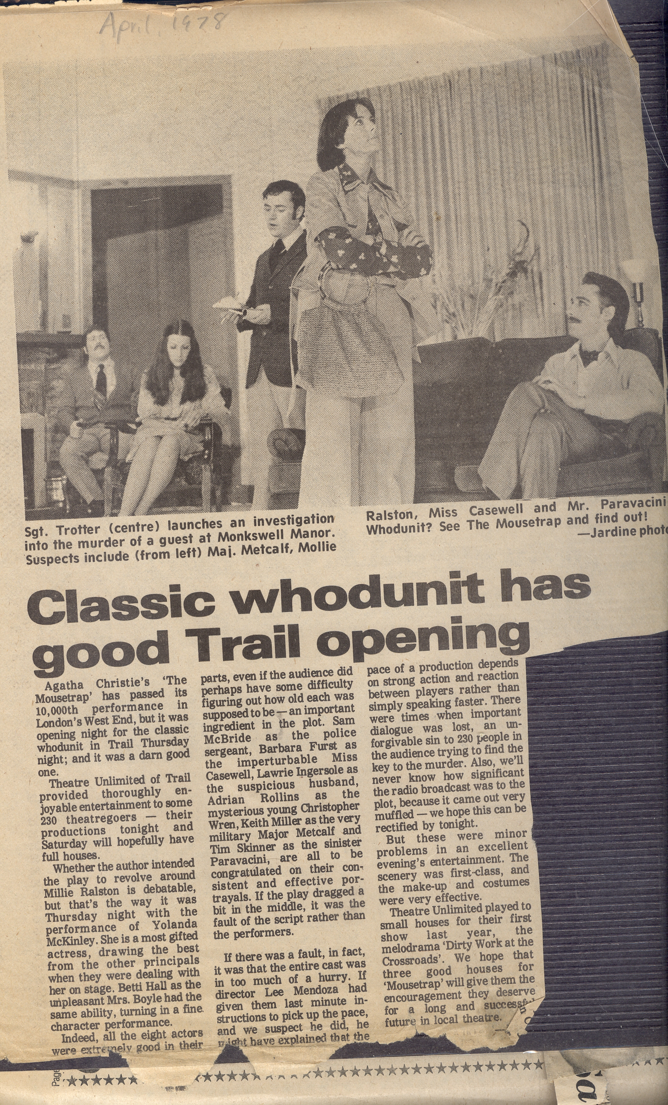 As its second show, Trail Theatre Unlimited chose to present Trail and district audiences with performances of Agatha Christie’s “The Mousetrap”, which had the distinction of being the longest-running play in the history of London theatre.