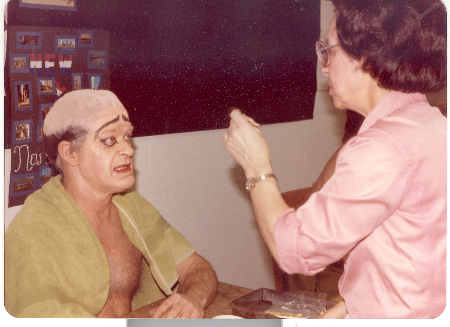 Audrey Millar doing George’s make-up for Koko in RLOP’s 1982 “Mikado” production.
