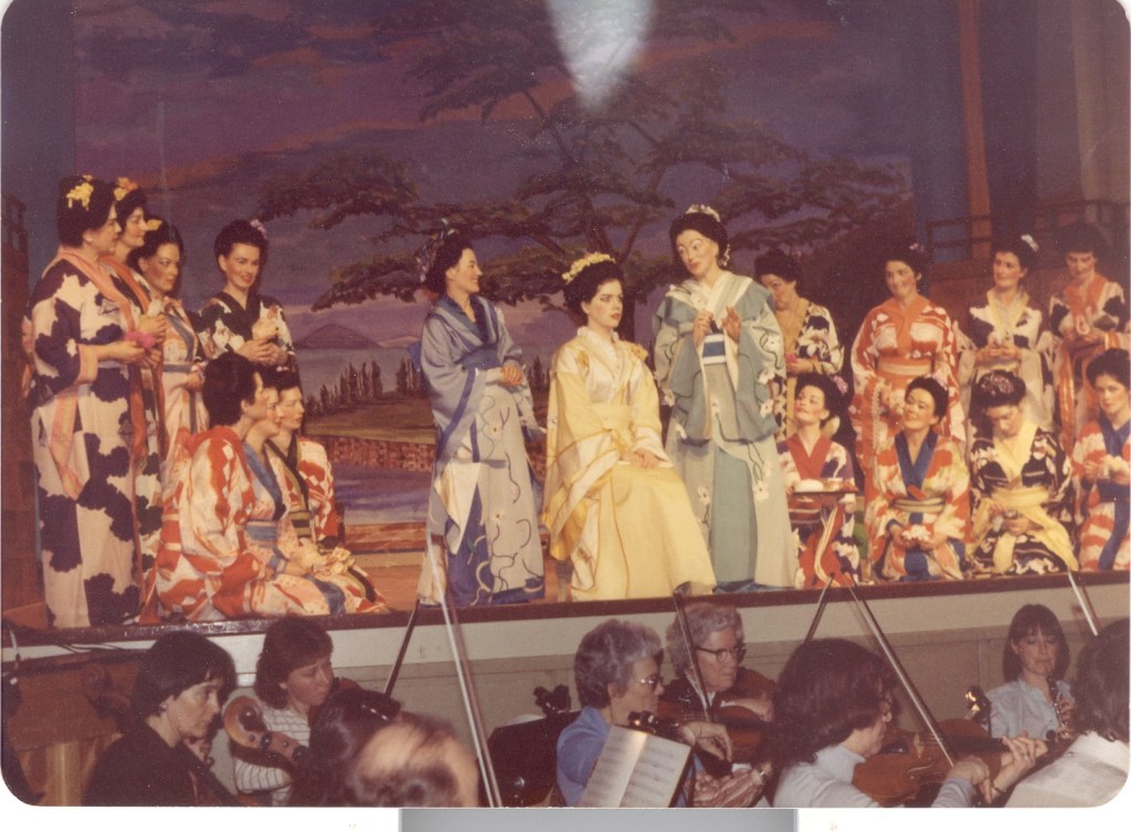 Above, in photo taken during the dress rehearsal for the 1980 “Mikado” production, are the Three Little Maids and members of the Ladies Chorus, with part of the orchestra in the foreground. The lead character Yum-Yum is seated in yellow, with Babs Bourchier as Pitti-Sing on her right, and Eleanor Honey as Peep-Bo on her left.From the RLOP “Mikado” show dress rehearsal. From left: Sam McBride as Pish-Tush, Babs Bourchier as Pitti-Sing, Rebecca Sims as Yum-Yum, and Brian Schroeder as Nanki-Poo.