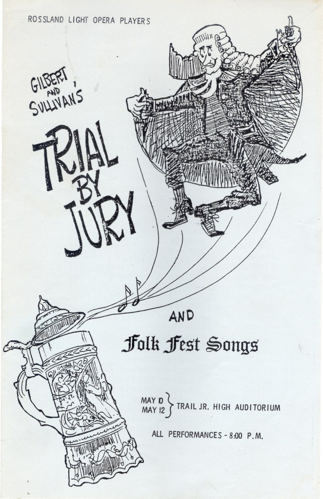 This show came soon after “Little Mary Sunshine”. George played the lead role as Judge, and I was a member of the jury. As “Trial By Jury” is about half as long as a regular production, the second half of the performances featured singing of rousing German Beer Hall-style songs. 1978.