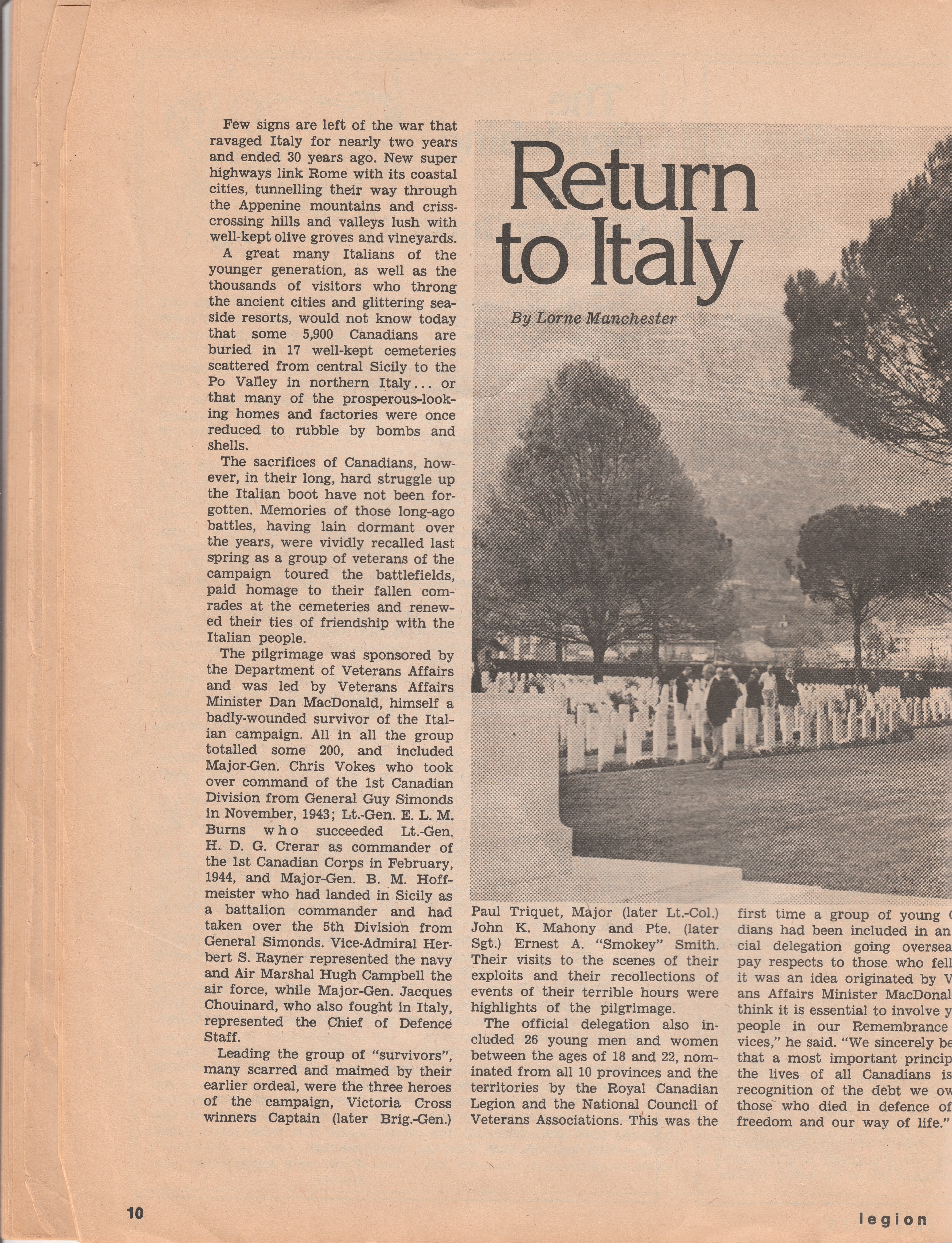 The pilgimage was sponsored by the federal Department of Veterans Affairs and led by Veterans Affairs Minister Dan MacDonald, himself a badly wounded survivor of the campaign, losing an arm and a leg. He said “I think it is essential to involve young people in our Remembrance services”, noting that the debt owed by all Canadians to those who died in defence of our freedom and our way of life must always be remembered.