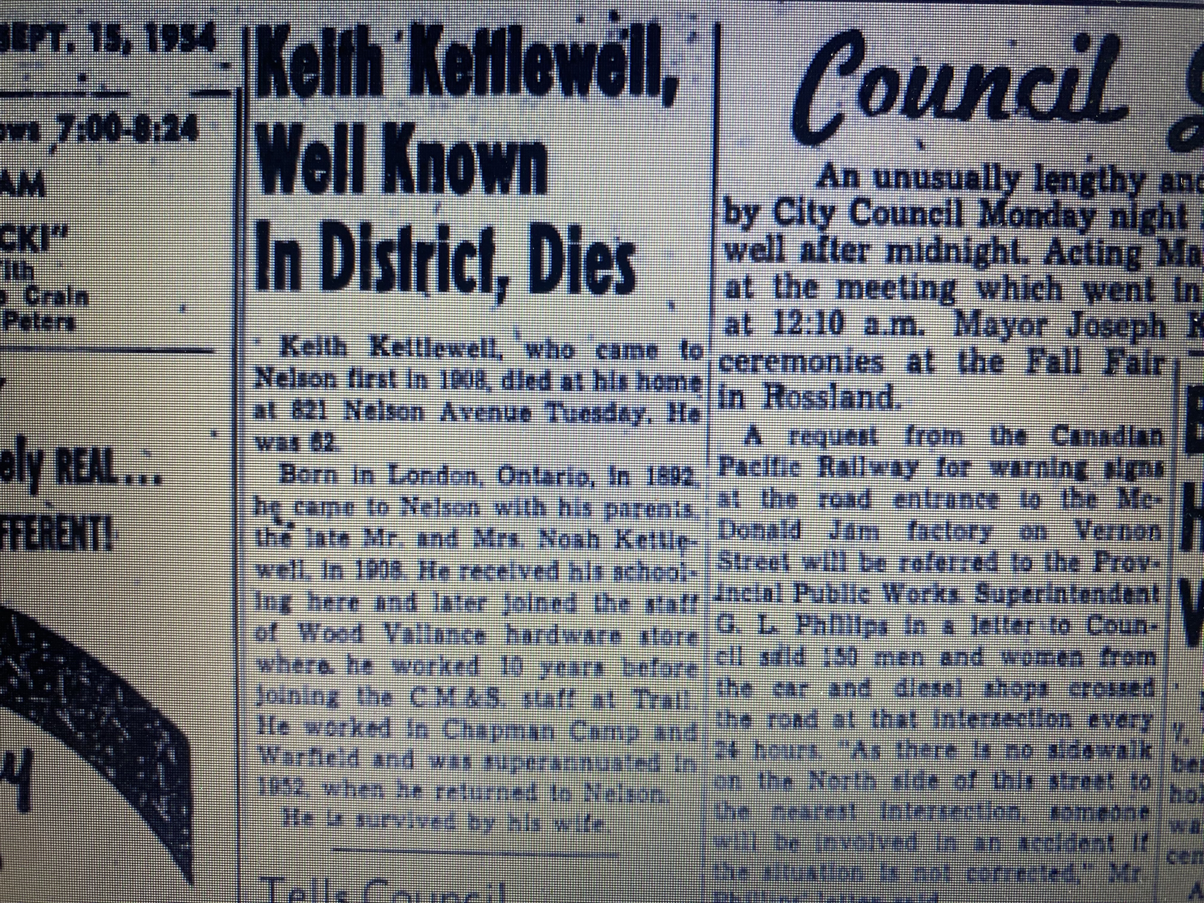 Nelson Daily News Sept. 15, 1954 report of death of Keith Kettlewell at age 64.
