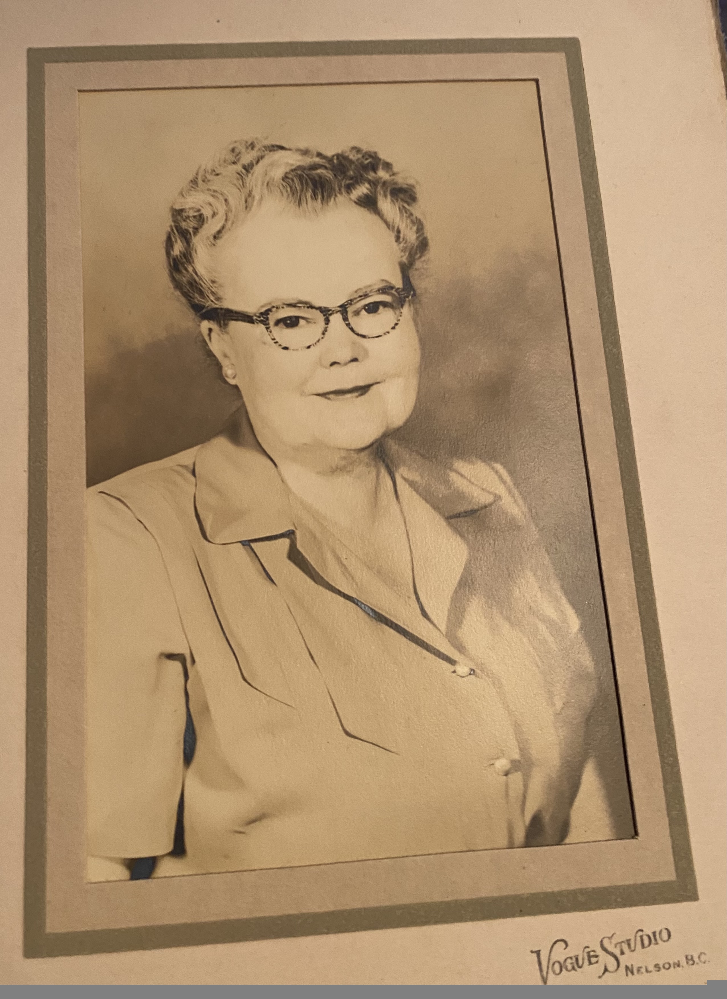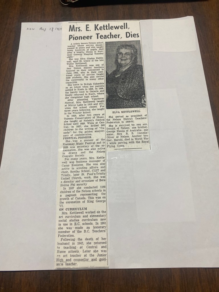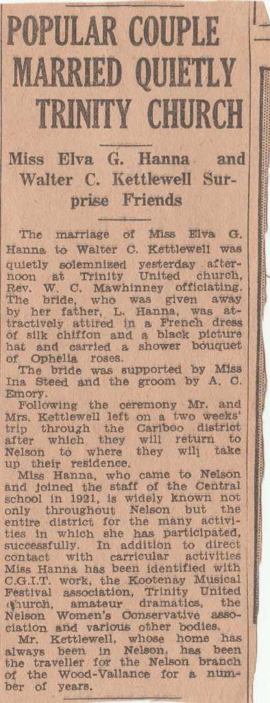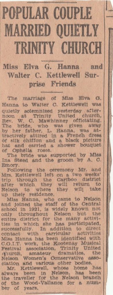 Someone in my family tree who stands out for exceptional, longtime contributions to Nelson and other West Kootenay communities is Elva Hanna Kettlewell (1896-1964), wife of my grandfather R.L. McBride’s first cousin Walter Kettlewell.