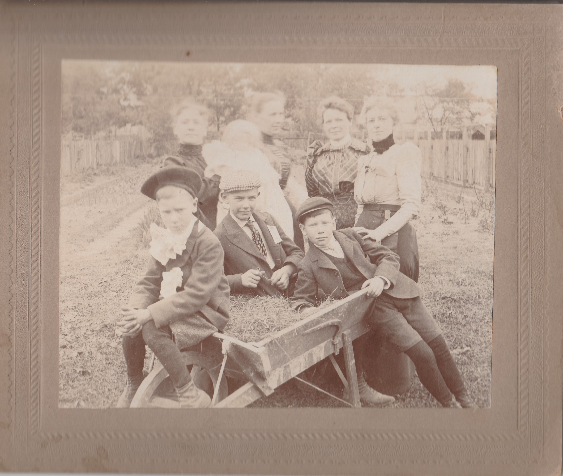 Walter Kettlewell, leaning, front right, at about age 10 in 1899 in London, Ontario. Beside him to his left are his cousin Fraser McPherson and brother Keith Kettlewell on far left. Behind them, from left to right, are Walter and Keith’s mother Kate McBride Kettlewell, aunt Martha McBride, aunt Mary McBride, and cousin Ruth McBride.