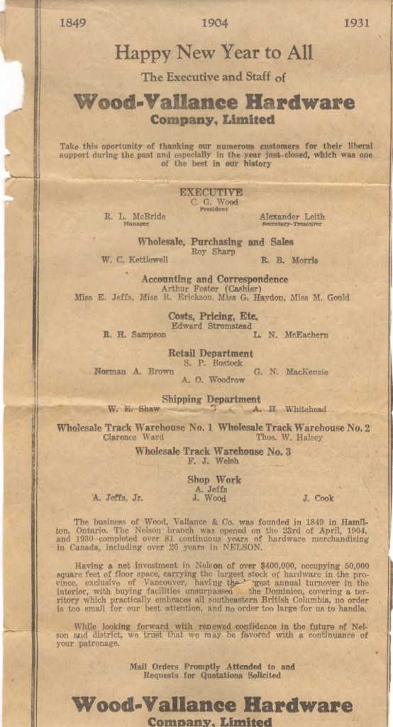 Keith would work for Wood Vallance in Nelson, serve in the First World War, and later settle in Trail where he managed Cominco’s hardware store for a number of years. In that era, Cominco was a substantial customer of Wood Vallance, and its president S.G. Blaylock had Wood Valllance manage part of Cominco’s purchasing function. My dad told me that his father and assistant Les McEachern would drive from Nelson to Trail every Thursday for purchasing meetings.