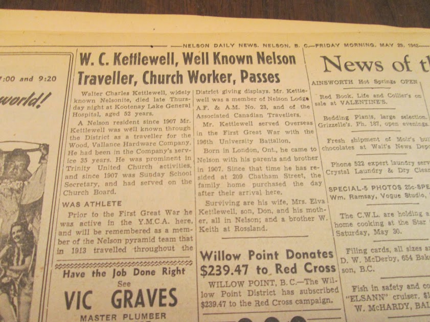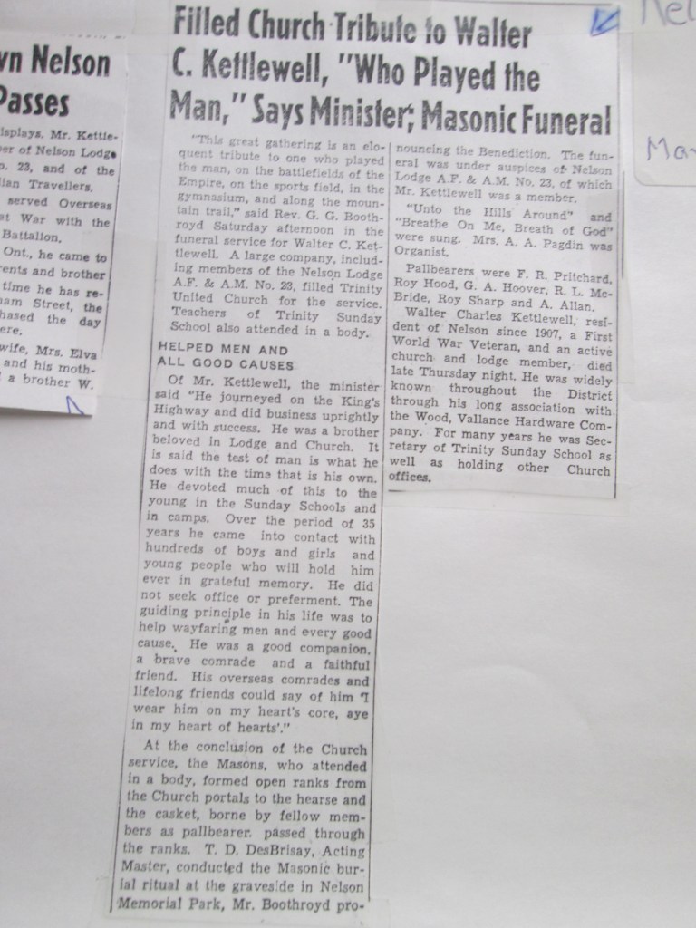 News reports of Walter’s death and funeral in 1942.Walter’s younger brother W. Keith Kettlewell on horseback.He was among the wounded in World War One. He came to Nelson from Ontario with Walter and their parents, Noah and Kate Kettlewell.