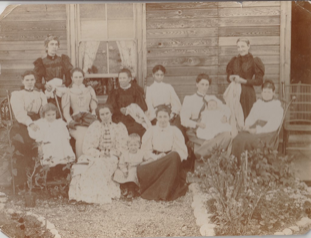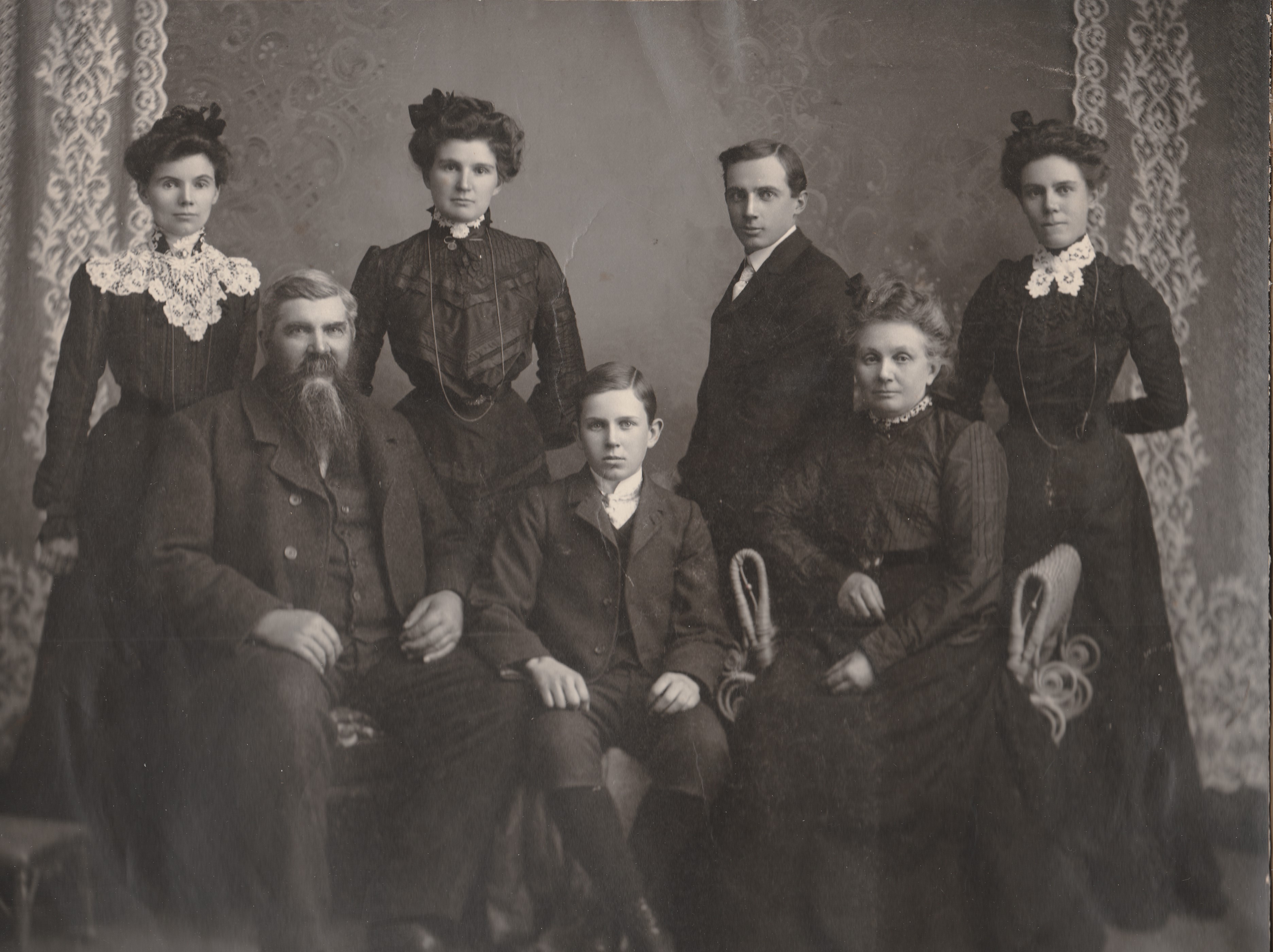 Elva’s mother Maud at far left in a Shugg family portrait, standing behind her father William Shugg (1841-1922). To date, I have not found an identified photo of Leander Hanna, who was husband of Maud and father of Elva and her siblings.
