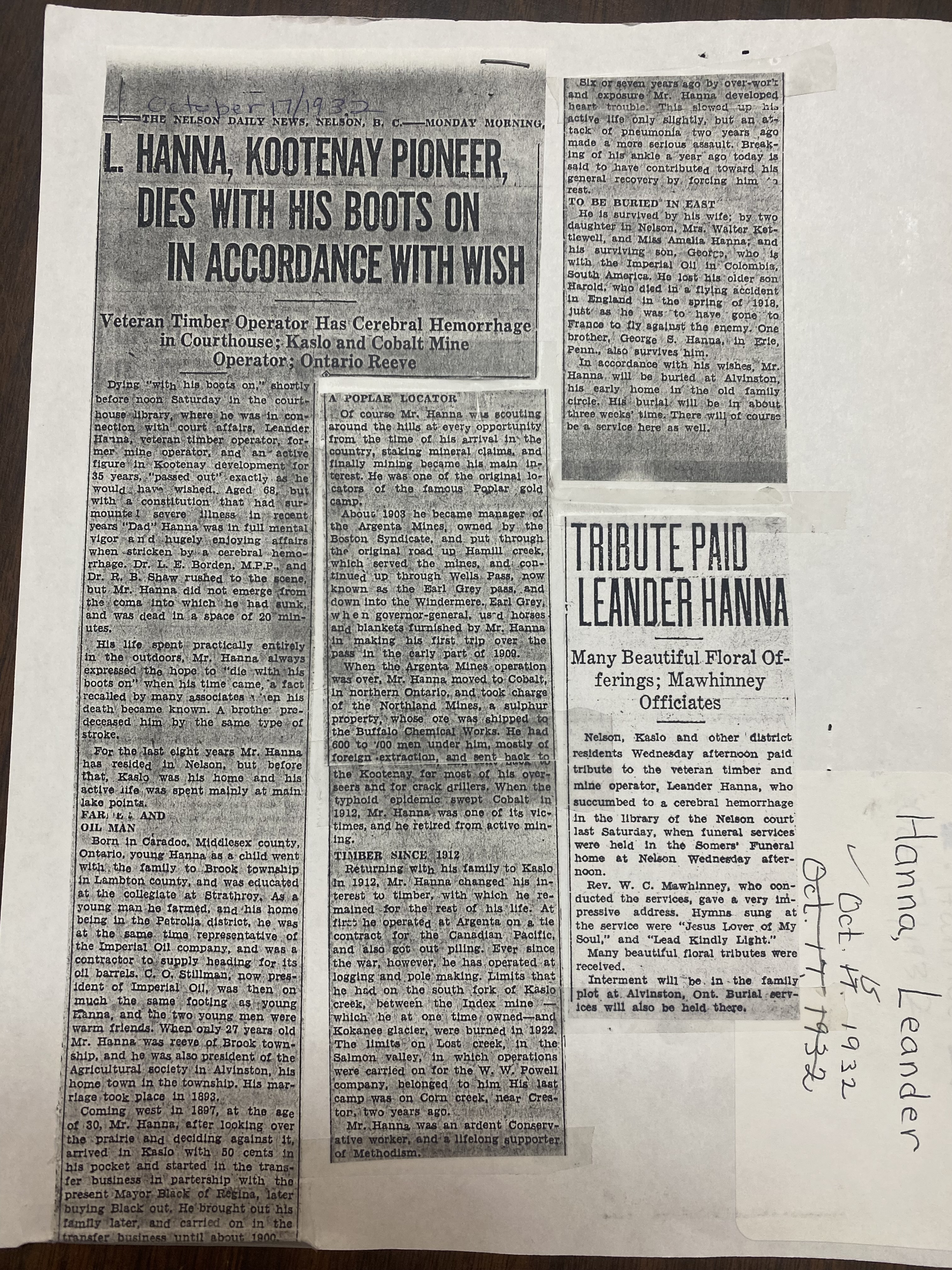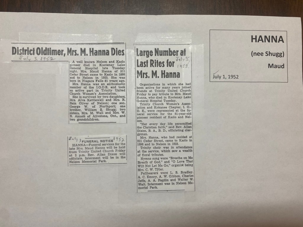 Elva was born in Watford, Ontario to Leander Hanna (1861-1932) and Maud Shugg (1871-1952), and came west to Kaslo as a baby when her father wholeheartedly joined the exciting mining boom at the north end of Kootenay Lake. The family moved to Cobalt, Ontario in 1909 for Leander’s mining work, then were welcomed back to Kaslo in 1912.