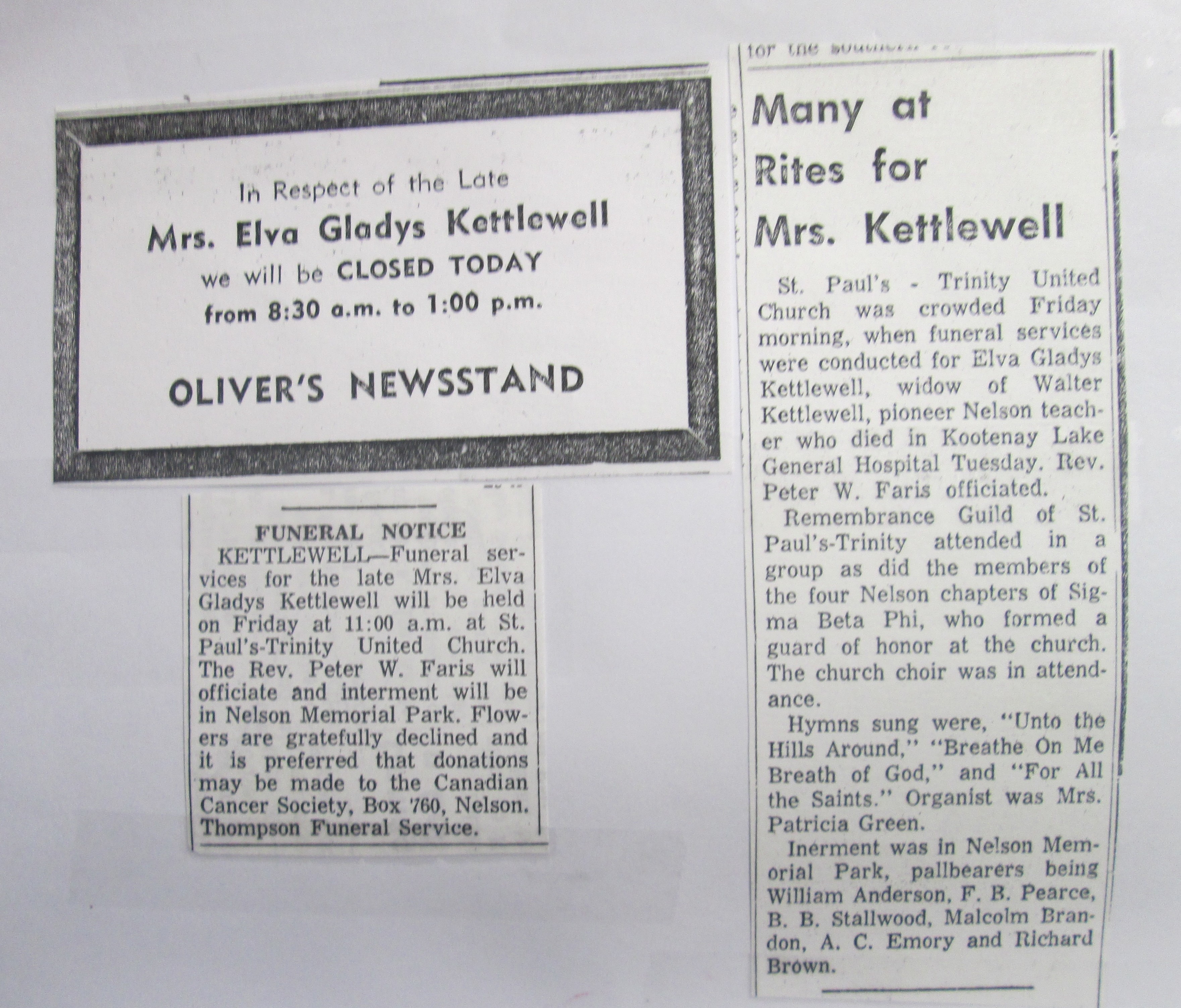 Elva married Walter Kettlewell in 1930, and their son Don was born in 1933.The Nelson Trinity United church was packed for the Elva’s memorial service in 1964. Outside the church, police helped to direct traffic for people coming for the funeral.